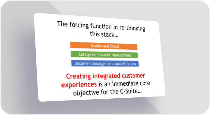 The forcing function in re-thinking this stack… Mobile and Cloud Enterprise Content Management Document Management and Workflow Creating integrated customer experiences is an immediate core objective for the C-Suite…
