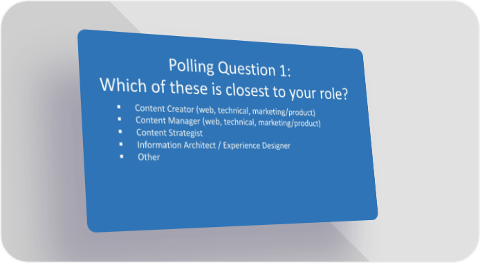 Polling Question 1: Which of these is closest to your role? § Content Creator (web, technical, marketing/product) § Content Manager (web, technical, marketing/product) § Content Strategist § Information Architect / Experience Designer § Other