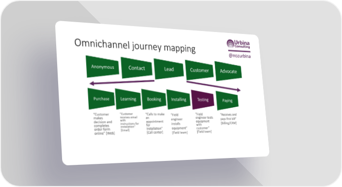 Omnichannel journey mapping @nozurbina Anonymous Contact Lead Customer Advocate Purchase Learning Booking Installing Testing Paying “Customer “Customer “Calls to make “Field “Field “Receives and makes receives email an engineer engineer tests pays first bill” decision and with appointment equipment completes instructions for for installs with [Billing/CRM] order form installation” installation” equipment” customer” online” [Web] [Email] [Call center] [Field team] [Field team]