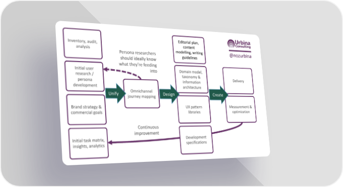 Editorial plan, Inventory, audit, content analysis Persona researchers modelling, writing @nozurbina should ideally know guidelines what they’re feeding Initial user into Domain model, research / taxonomy & Delivery persona information development architecture Unify Omnichannel Design Create journey mapping Brand strategy & UX pattern Measurement & commercial goals libraries optimization Continuous improvement Initial task matrix, Development insights, analytics specifications