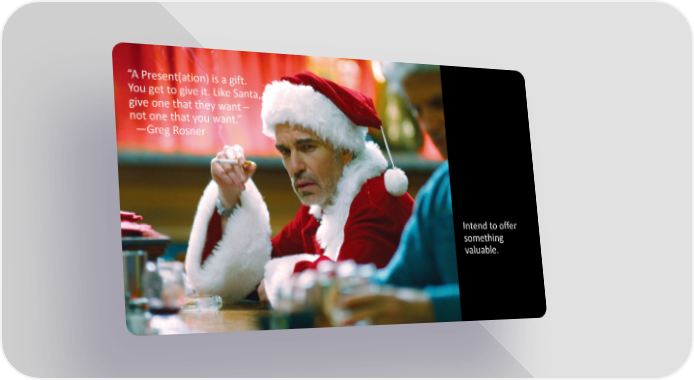 “A Present(ation) is a gift. You get to give it. Like Santa, give one that they want – not one that you want.” —Greg Rosner Intend to offer something valuable.